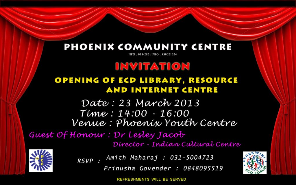 As part of our work around early Childhood Development, the PCC launched a children’s library on Saturday 23rd March 2013. The Library was officially launched by Dr Lesley Jacob (now late), director of the Cultural Centre based in the office of the Indian Council General in Durban. The aim was to stock children’s books and make them available on loan to various creches from time to time. A programme was also tun by the library to recite children’s stories and to teach children how to read.